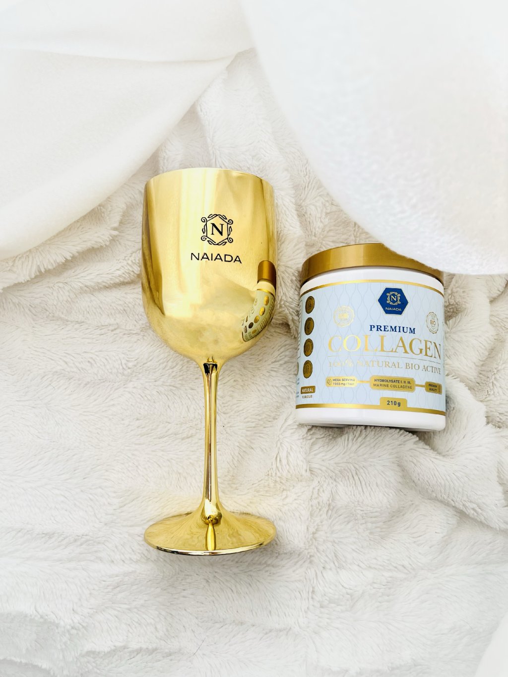 Vychutnejte si svou denní dávku hydrolyzovaného mořského kolagenu z luxusní zlaté skleničky NAIADA®.