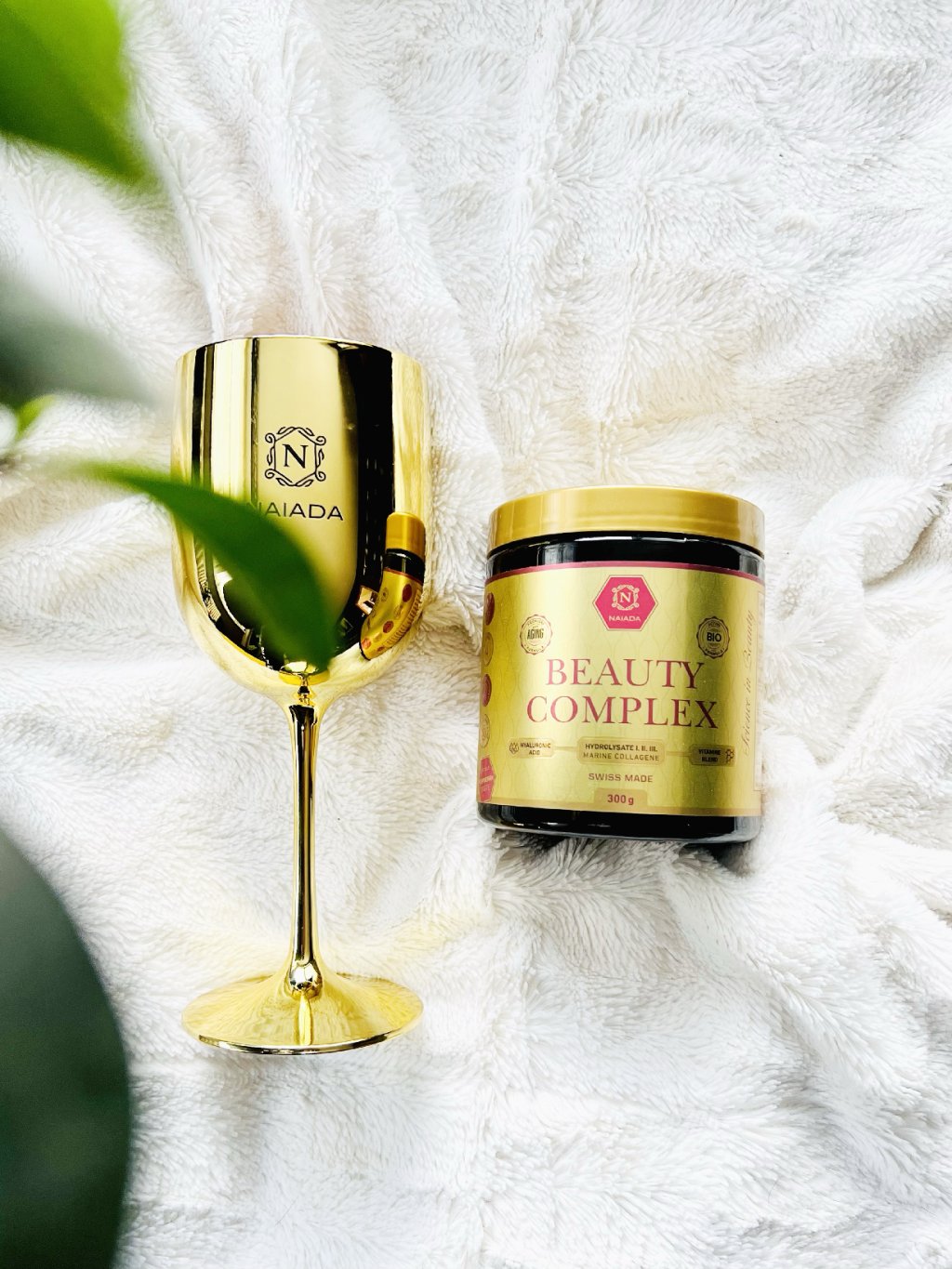 Akční sada, která se skládá z Anti Aging Beauty Complexu příchuť malina a zlaté skleničky s logem Naiada® pro ještě větší požitek z pití kolagenu.