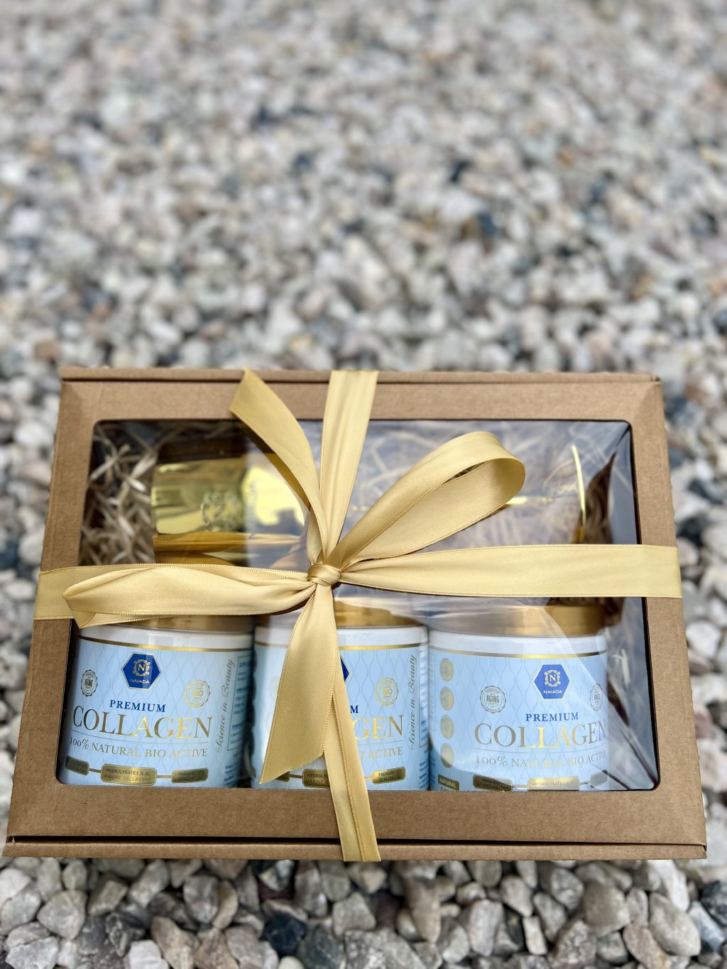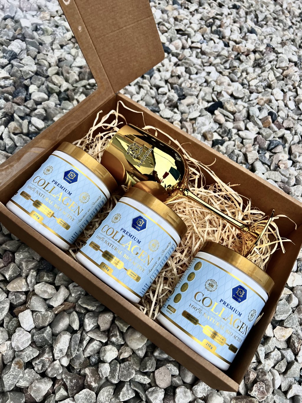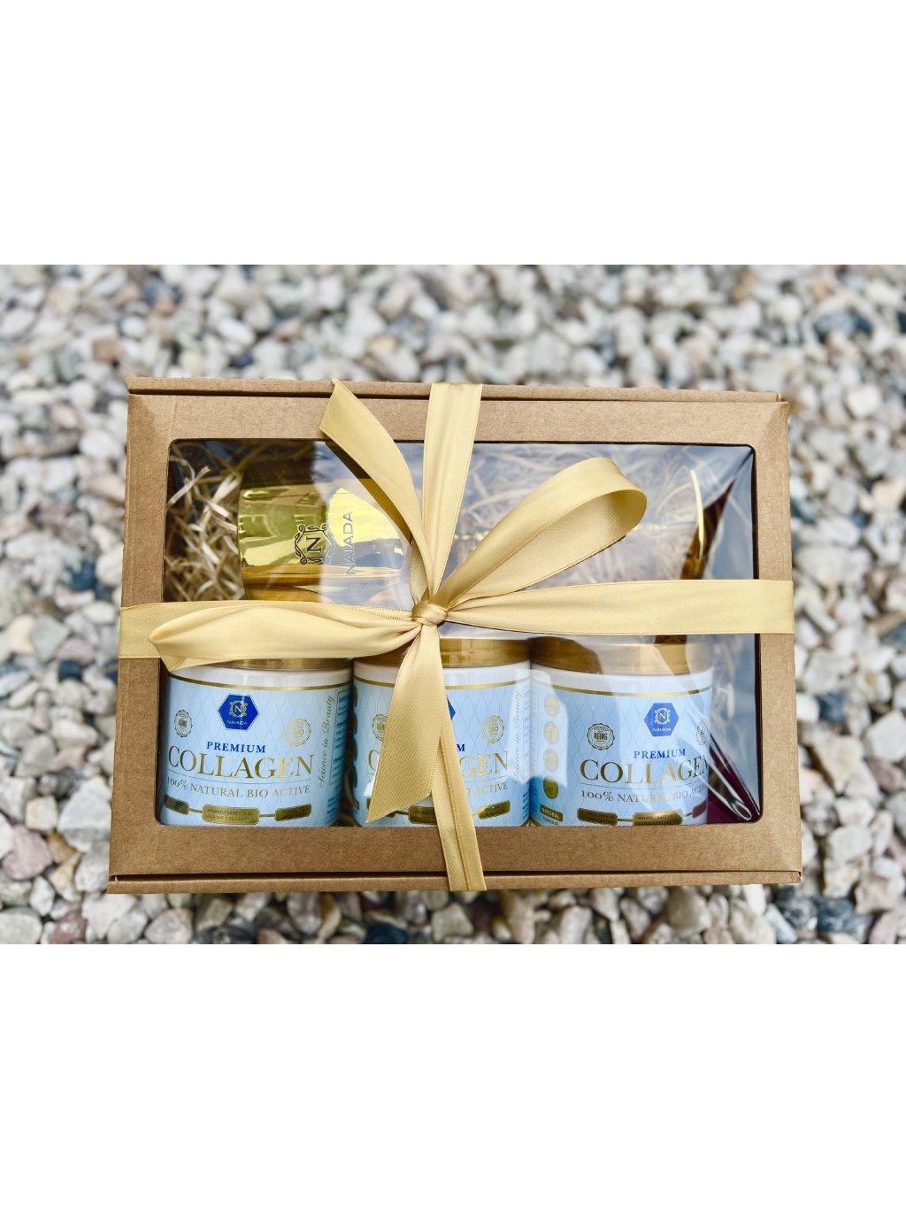 NAIADA® Modrá dárková sada obsahuje 3x Premium Bio Active Collagen, zlatou skleničku s logem Naiada® a samozřejmě dárkové balení, které Vám ušetří čas a obdarovanému udělá radost.